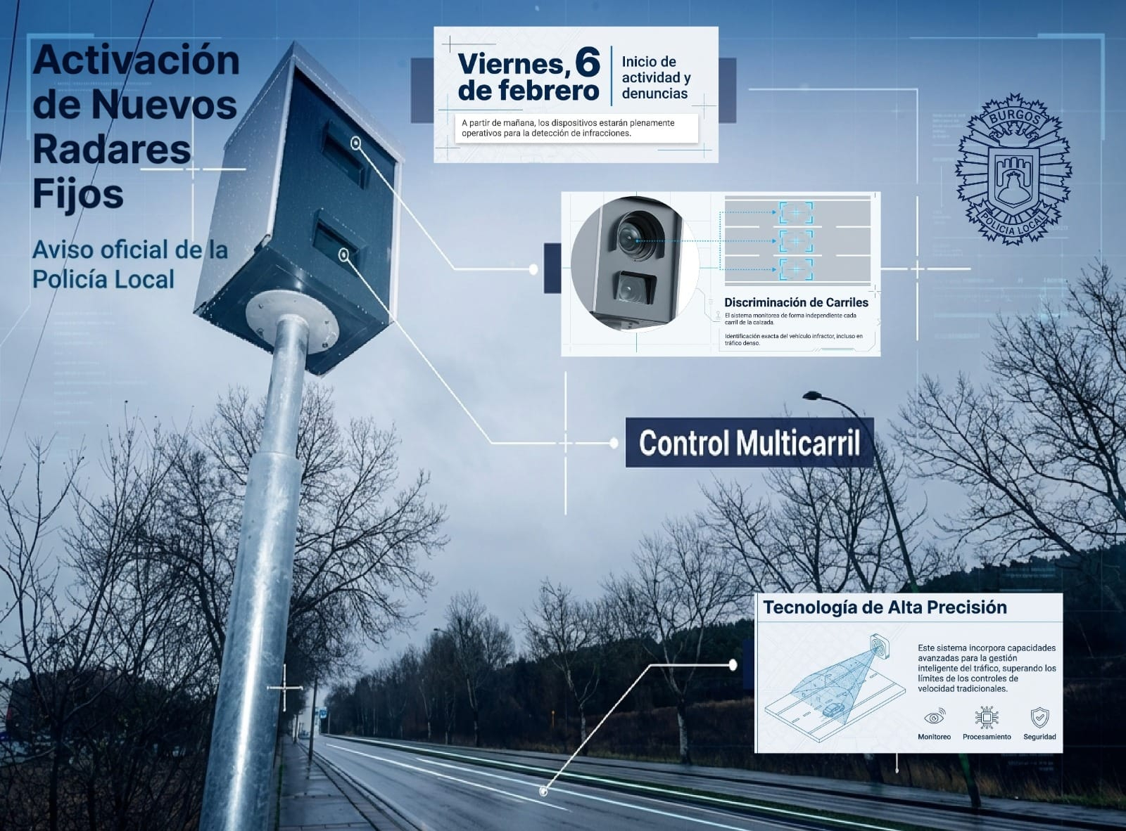 La Policía Local de Burgos ha informado en sus redes sociales que a partir de mañana, viernes 6 de febrero, se pondrán en funcionamiento los nuevos radares instalados en la carreteria del Cementerio y en El Plantío.