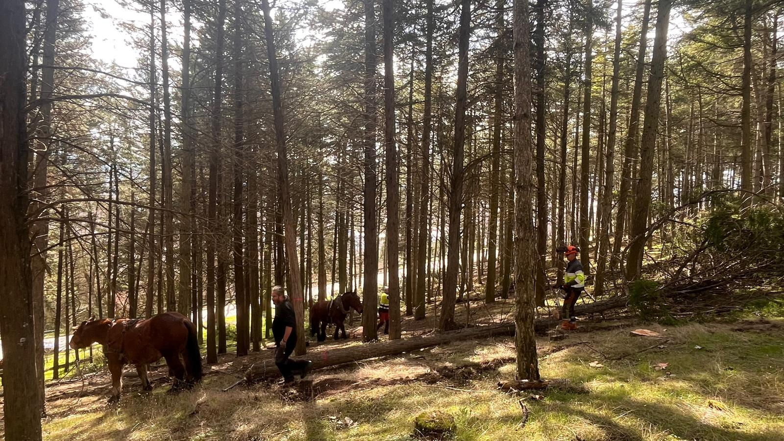 Durante la primera fase de los trabajos se están utilizando caballos hispano-bretones para retirar la madera, un método tradicional que permite trabajar con mayor cuidado en zonas de ladera y en terrenos delicados, evitando daños en el suelo. Posteriormente, se incorporará maquinaria forestal para continuar con el proceso y retirar los restos.