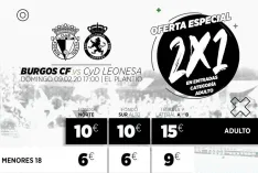 Los aficionados del Burgos Club de Fútbol que adquieran una entrada para el encuentro de este domingo recibirán otra de manera gratuita. El club, con el ánimo de conseguir la mejor entrada posible en El Plantío, ofrece a sus seguidores la posibilidad de acudir acompañados por el mismo precio.