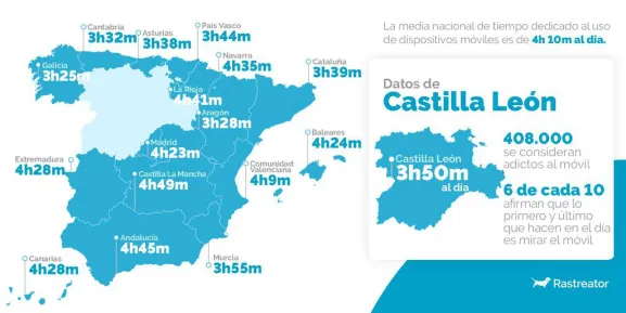 Este análisis desvela que los españoles usan cada vez más el smartphone, una media de 4 horas y 10 minutos al día, una hora más que hace dos años. En cuanto a este consumo por regiones se encuentran entre los que más tiempo dedican los castellano-manchegos (4 horas y 49 minutos), los andaluces (4 horas y 45 minutos) y riojanos (4 horas y 41 minutos). Por el contrario, gallegos (3 horas y 25 minutos), cántabros (3 horas y 32 minutos) y asturianos (3 horas y 38 minutos) son los que se sitúan como los que menos horas lo usan.
