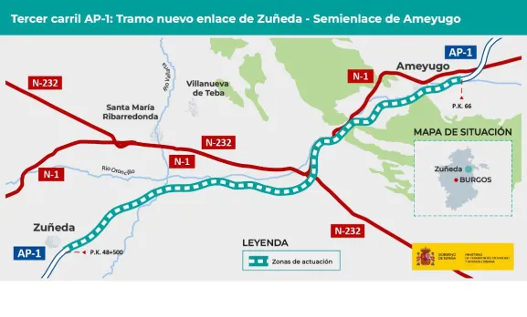 El Ministerio de Transportes, Movilidad y Agenda Urbana (Mitma) ha licitado la redacción del proyecto "Redacción de Proyecto de trazado y construcción: Tercer carril en la autopista AP-1. Tramo: Nuevo Enlace de Zuñeda - Semienlace de Ameyugo", en la provincia de Burgos. El anuncio correspondiente será próximamente publicado en el Boletín Oficial del Estado (BOE).