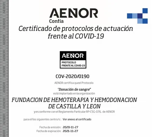 La donación de sangre ha sido un proceso sanitario completamente seguro durante toda la pandemia de Covid-19. Pero para dar aún mayor seguridad a sus usuarios, el Centro de Hemoterapia y Hemodonación de Castilla y León (CHEMCYL) solicitó, el pasado mes de octubre, la certificación voluntaria en protocolos de actuación frente al COVID-19 a AENOR.