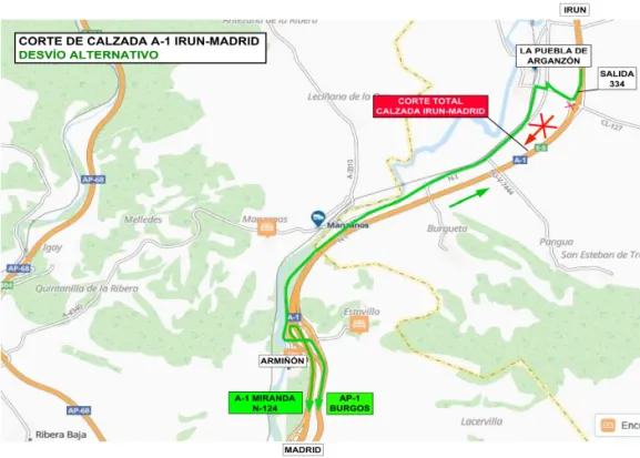 • Para asegurar la fluidez del tráfico durante dichas afectaciones, sehabilitará un itinerario alternativo, debidamente señalizado, mediante undesvío por la salida 334 de la autovía A-1 a la carretera autonómica CL-127, en sentido la Puebla de Arganzón. Desde esta carretera se enlazarácon la carretera nacional N-1 en sentido Madrid, hasta llegar al enlace deArmiñón en la salida 328 de la autovía A-1.Se podrá incorporar el tráfico por este enlace de la salida 328, tanto alitinerario de las carreteras A-1/N-124 en sentido Miranda de Ebro/Logroño,como al itinerario de la autopista AP-1 en sentido Burgos.Durante estas afectaciones, se llevarán a cabo principalmente los trabajosde colocación de los pórticos de señalización previstos en la ejecución delas referidas obras, sobre la calzada Irún-Madrid de la autovía A-1, ademásde otros trabajos de señalización horizontal y en mediana en la mismacalzada.