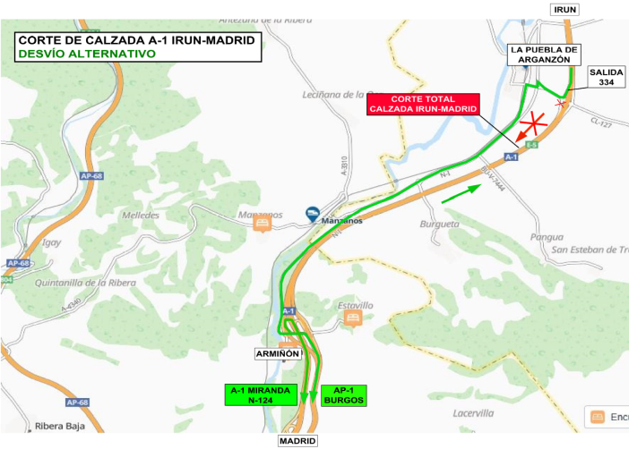 Se producirá un corte total del tráfico en la calzada de la A-1sentido Irún-Madrid, entre la salida 334 (La Puebla de Arganzón,provincia de Burgos) y la salida 328 (Armiñón, provincia de Álava)