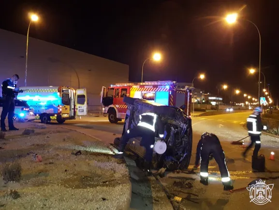Los bomberos de Burgos han tenido que movilizarse esta madrugada tras el aparatoso accidente que sufría un vehículo en el polígono industrial de Villalonquéjar, en concreto, en la glorieta de la calle López Bravo con Merindad de Valdivielso.