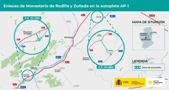 El Ministerio de Transportes y Movilidad Sostenible ha aprobado provisionalmente y ultima los trámites para someter a información pública el proyecto de trazado que plantea la ejecución de los enlaces de Monasterio de Rodilla y Zuñeda en la autopista AP-1, en la provincia de Burgos, para lo que se cuenta con un presupuesto estimado de los trabajos en 48,6 millones de euros (IVA incluido).