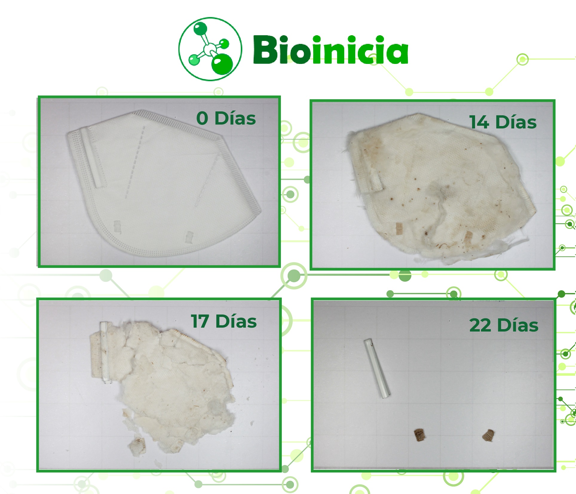 Precisamente este aliado, la mascarilla, ha supuesto un nuevo riesgo para nuestro planeta. Un simple gesto como es quitarse la mascarilla y deshacerse de ella puede llegar a suponer un gran perjuicio en el medio ambiente. Tirar las mascarillas en el W.C. o en el suelo, y no hacerlo en los lugares recomendados es un grave problema, ya que supone el mismo daño que arrojar toallitas y plásticos. Por eso Bioinicia ha desarrollado la Mascarilla Higiénica Bio con ajuste EPI, la primera mascarilla compostable de nanofibras del mundo desarrollada por la empresa Bioinicia junto con el CSIC, que tiene una filtración frente a aerosoles superior a un 98% y composta en 22 días.