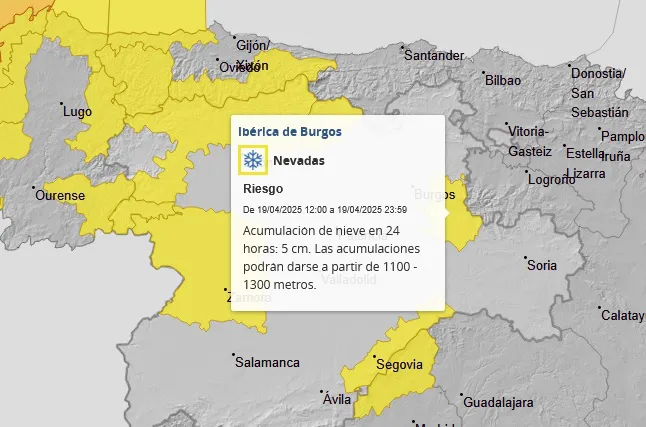En concreto, los avisos amarillos se sitúan en la Ibérica de Burgos, la Cordillera Cantábrica en León y Palencia; el Sistema Central en Segovia, y en Sanabria, en Zamora.