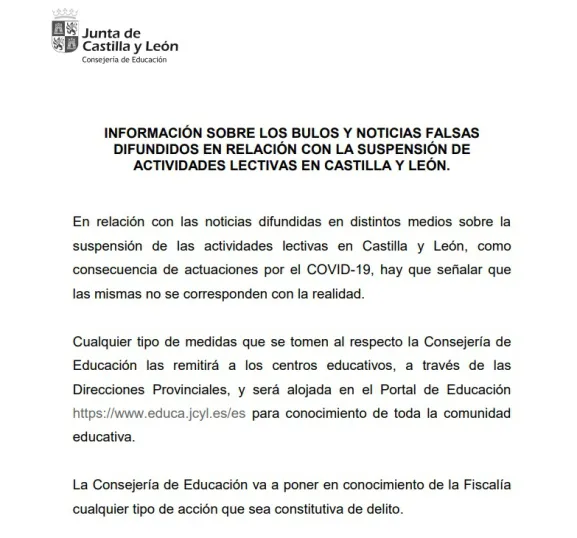 Si te ha llegado a tu wassap o redes sociales un comunicado firmado por el Ministro de Sanidad que afirma que se suspenden las clases en toda Castilla y León por Coronavius, te informamos que es falso.