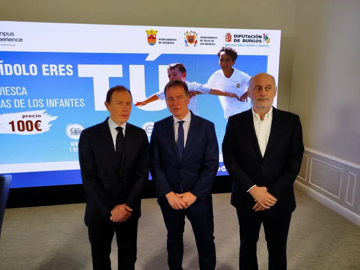 El presidente de la Diputación de Burgos, Borja Suárez, ha acompañado en el acto a las leyendas del Real Madrid, Emilio Butragueño y Ricardo Gallego, y ha detallado el funcionamiento de los campus, centrados en el entrenamiento técnico, la mejora física y la transmisión de valores vinculados al deporte.