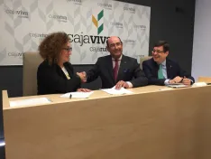 Agustín Colino, Director del Área de Negocio de Cajaviva Caja Rural y Consuelo Fontecha, Presidenta de la Federación de Comercio de Burgos (FEC) unen sus fuerzas y renuevan el convenio para impulsar el desarrollo sectorial del comercio de la provincia.