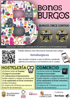 El Ayuntamiento de Burgos ha lanzado dos campañas de bonos al consumo que se podrán adquirir a partir del 13 de septiembre. El objetivo de esta iniciativa es apoyar económicamente y fomentar el consumo de los burgaleses en los sectores del comercio minorista de proximidad y la hostelería de la ciudad, los grupos económicos más afectados por la crisis económica ocasionada por la pandemia de la COVID-19.