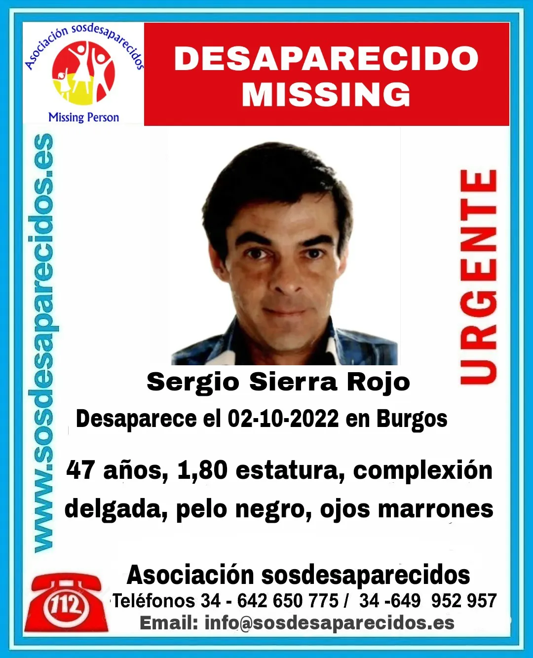 Según publica el portal sosdesaparecidos.com ha desaprecido Sergio Sierra Rojo de 47 años en Burgos.