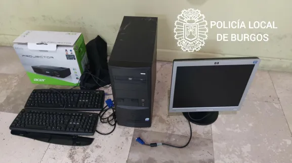Tres patrullas de Policía Local se acercaron a la zona y localizaron en el Bulevar, cerca de la calle San Julián, a uno de los implicados portando varios teclados, cables de conexión y diverso material informático en una caja.