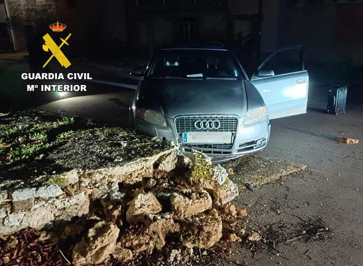 En la huida sufrió un siniestro vial -en el mismo casco urbano- al chocar contra un muro de contención de una zona ajardinada; el conductor y sospechoso abandonó a pie la zona, aunque instantes más tarde era descubierto, oculto, en las proximidades aprovechándose de la falta de luz, ya que era de noche.