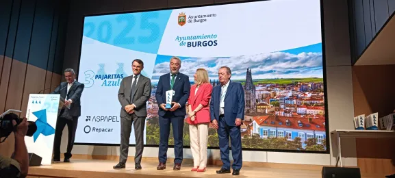 El concejal de Medio Ambiente del Ayuntamiento de Burgos, Carlos Niño, ha recogido este jueves en Madrid las tres pajaritas azules que otorga Aspapel por el reciclaje de papel y cartón.