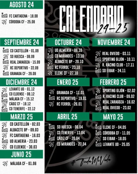Los de Jon Pérez Bolo estrenarán la temporada enfrentándose al FC Cartagena en El Plantío durante fin de semana del 17 y 18 de agosto, en horario todavía por confirmar. Su primera visita de la temporada será al Nuevo El Arcángel en la jornada 2 para enfrentarse al recién ascendido Córdoba CF durante el fin de semana del 25 de agosto.
