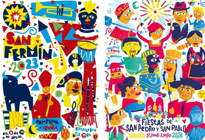 El diseño elegido para representar a las Fiestas de San Pedro y San Pablo, a la derecha de la imagen, recuerda "levemente" a la composición y estilo por el que se decantó su autor para el cartel de San Fermín. Si bien es cierto que cada diseñador, pintor, escultor, músico (artista, en definitiva) hilan sus obras conforme a un estilo propio, comparando ambos proyectos se pueden apreciar con claridad más las similitudes que las diferencias: fondo blanco, figuras desparramadas por la escena y a todo color, pequeños elementos festivos como guirnaldas o confeti... Quizá, si se puede añadir como contrapunto, en el caso del cartel de Burgos hay pequeñas líneas de contorno y algunos protagonistas, como el tamborilero o la gigantilla, recuerdan vagamente a estilos picassianos...