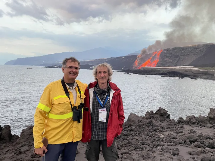 Josep M. Parés, coordinador del Programa de Geocronología y Geología del Centro Nacional de Investigación sobre la Evolución Humana (CENIEH) se encuentra esta semana en la isla de La Palma invitado por Vicente Soler, investigador vulcanólogo del Instituto de Productos Naturales y Agrobiología (IPNA-CSIC) en Canarias, para ver de primera mano el desarrollo de la actividad volcánica de Cumbre Vieja en la zona de Cabeza de Vaca y valorar posibilidades de investigación sobre el terreno, con el fin de llevar acabo colaboraciones futuras.