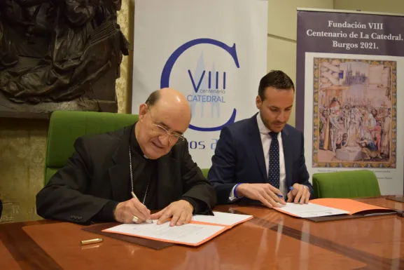 El presidente del patronato de la «Fundación VIII Centenario de la Catedral. Burgos 2021», Fidel Herráez Vegas, y el presidente del Club Baloncesto Miraflores, Félix Sancho Arnáiz, han firmado esta mañana un convenio de colaboración entre ambas entidades. Gracias a este acuerdo, el Club se compromete a incluir el logotipo de la Fundación, especialmente, en la equipación del equipo profesional. Asimismo, podrá hacerlo en cuantos soportes considere adecuados y a través de las actividades que se puedan desarrollar en el espacio del Coliseo en el que juegan los partidos, así como en el autobús utilizado por el equipo para sus desplazamientos.