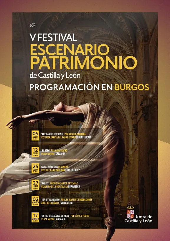 La programación de esta nueva edición del Festival Escenario Patrimonio de Castilla y León', que se inicia este fin de semana, contará con seis espectáculos en localidades de la provincia de Burgos: Fuentespina, Sasamón, Castrojeriz, Briviesca, Villadiego y Mahamud.