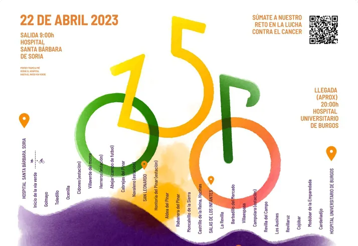 El cartel diseñado por @urniaco nos muestra en el cartel, la distancia que hay entre los hospitales de Soria y Burgos (150 de la bicicleta) y el camino por los que pasará la marcha de 'PEDALOVIDA', camino de sobra conocido por los pacientes oncológicos de nuestra provincia. Desde la organización quieren dar las gracias a todos los patrocinadores que han hecho posible que esta iniciativa salga adelante.