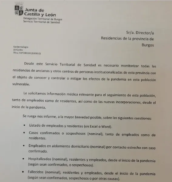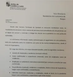 El Servicio Territorial de Sanidad de Burgos (Epidemiología) ha enviado a todas las residencias de la provincia un escrito solicitando datos e información con la intención de que sean monitorizadas para así poder controlar mejor los efectos del Coronavirus entre los residentes.