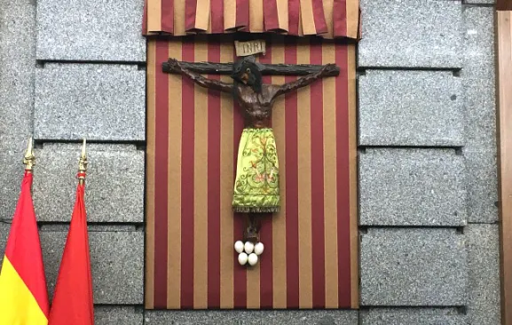 La pareja, parece que "poco o nada creyentes" pidieron al oficiante (en este caso el concejal de Podemos, Israel Hernando) que retirara el Cristo de Burgos que preside el Salón. Tras la correspondiente consulta por parte del edil, le dijeron que tenía que ser el Alcalde el que decidiera.