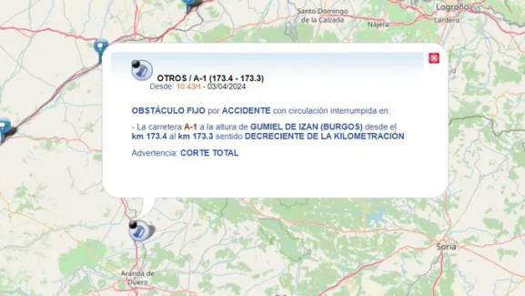 Cerca de las 10.45 h del mediodía de este miércoles, un aparatoso accidente ha obligado a cortar la A-1 en Gumiel de Izán, hacia Madrid, desde el kilómetro 173.4 al kilómetro 173.3 en sentido decreciente de la kilometración.