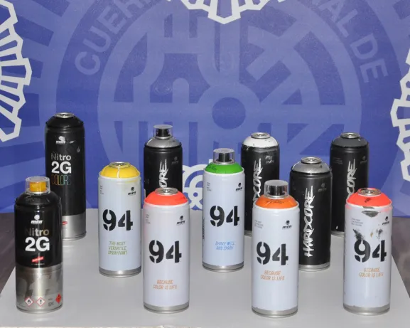 Una vez en el interior del recinto localizaron al joven menor de edad quien portaba una mochila. Manifestó a los policías que había accedido a la nave para realizar grafitis. Los agentes constataron que en el interior de la mochila se encontraban once botes de pintura en espray de diferentes colores y en el interior del recinto numerosas pintadas, tipo grafitis, por lo que se procedió a la intervención de los botes de pintura.