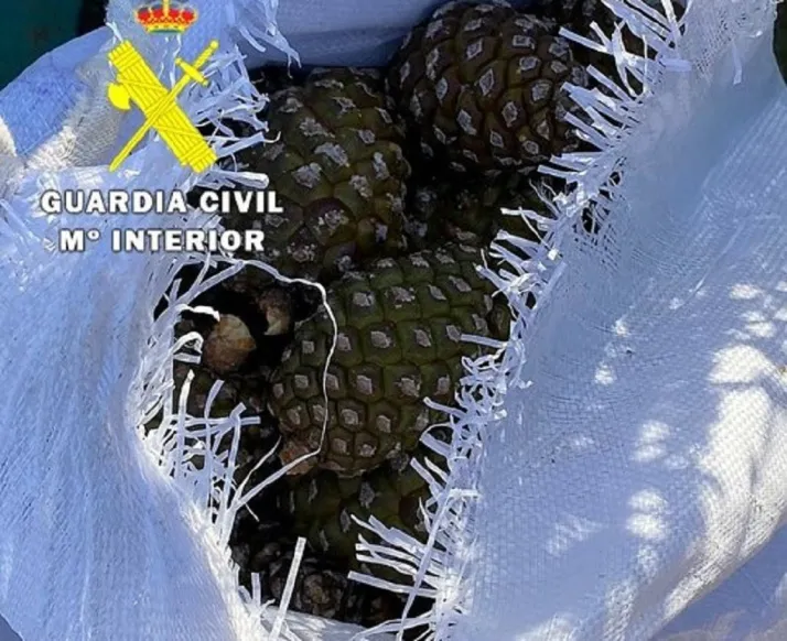 La Guardia Civil ha investigado a S.Z. (42) como presunto autor de un delito de hurto de piñas piñoneras por la recolección y apropiación de 150 kilogramos de estos frutos silvestres -actividad realizada sin Licencia de Aprovechamiento- que transportaba en un vehículo que fue interceptado cuando huía del lugar.