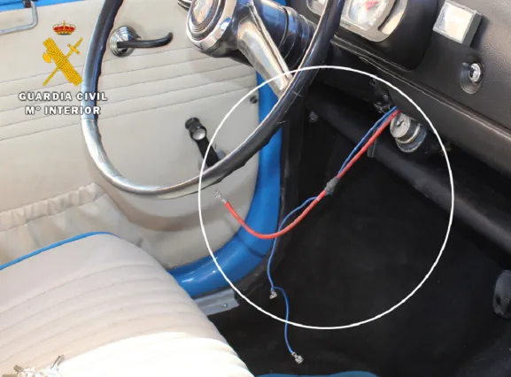 Este presentaba el bombín de la puerta forzado, los cables del arranque sueltos y el volante doblado, daños provocados cuando pretendían anular el bloqueo de la dirección. Al no ser capaces de ponerlo en marcha, lo empujaron hasta el cauce de un arroyo próximo, abandonándolo.