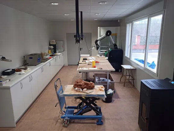 En gran medida esos logros del Museo se sostienen por un trabajo especializado que se desarrolla en el laboratorio de restauración, único en Castilla y León en el campo de paleontología de dinosaurios. Esta actividad se ve ahora reforzada y facilitada por el nuevo laboratorio, que cuenta con vibroincisores de diversa potencia y equipos de ultrasonidos (instrumentos de precisión de laboratorio con aire comprimido) ; cuba de ultrasonidos con control de frecuencia y temperatura ; banco campana de doble aspiración ; armario de seguridad para ácidos ; grupo carrelado filtro-aspirante ; estufa termostática. Ello permitirá, a partir de ahora, un tratamiento del patrimonio paleontológico similar al de otros centros europeos.