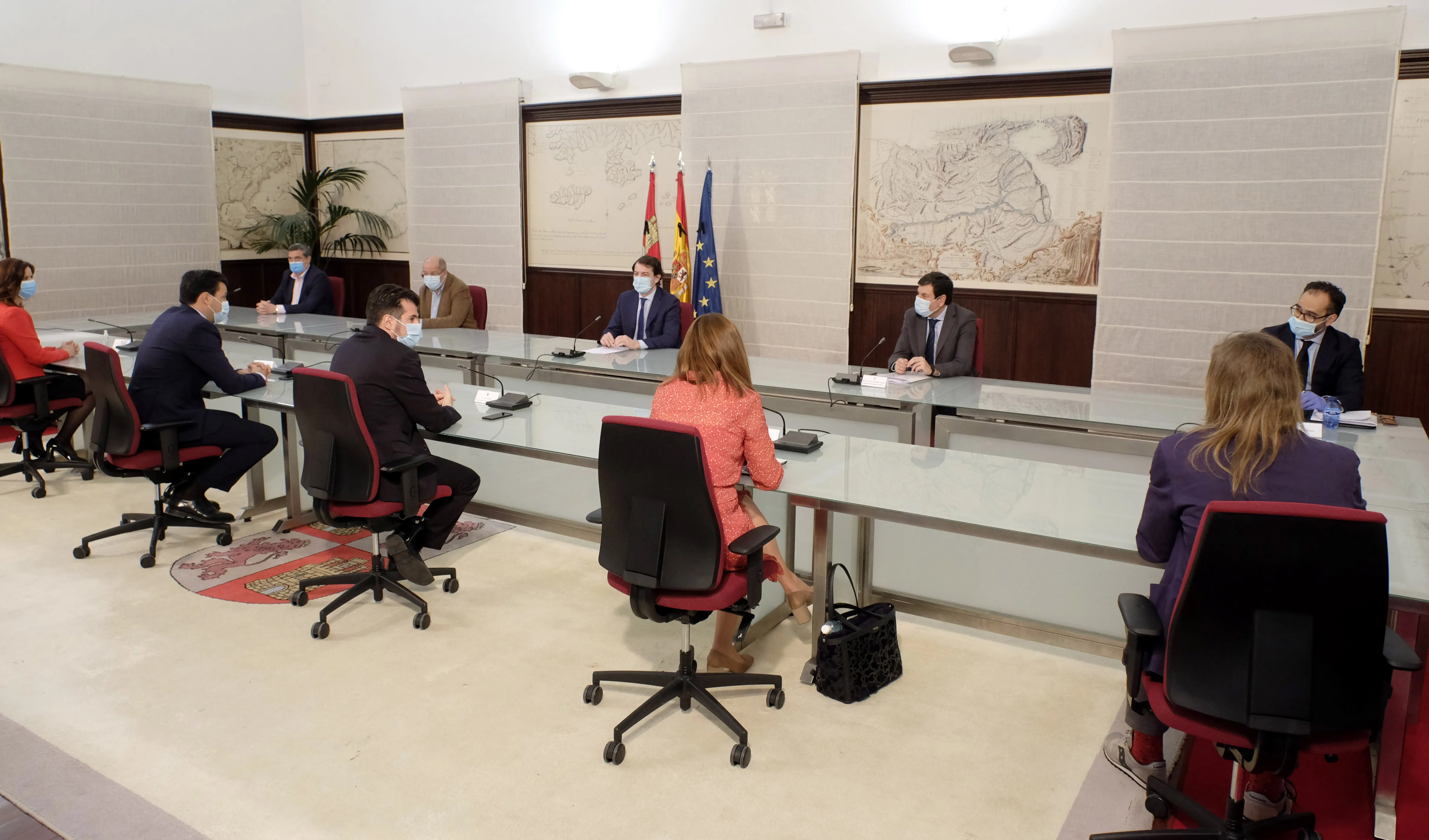 El presidente de la Junta de Castilla y León, Alfonso Fernández Mañueco, junto al vicepresidente, Francisco Igea, se ha reunido esta mañana con los portavoces de todos los partidos políticos con representación en el Parlamento autonómico para avanzar en la negociación de un pacto para la recuperación económica, el empleo y la cohesión social en la Comunidad. Tras agradecer la disposición al diálogo de todos los participantes en la reunión, Fernández Mañueco ha subrayado que este pacto debe tener como único objetivo facilitar las cosas a los trabajadores, a las empresas y a las familias de Castilla y León, para lo cual la necesidad de llegar a un acuerdo está por encima de cualquier interés de partido.