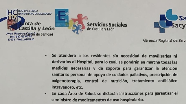 Basa su decisión en la documentación remitida por la Junta de Castilla y León -que fue publicada además por eldiario.es- como el de 'Medidas generales para contener el impacto de la crisis del COVID-19 en las residencias de carácter social', de fecha 20 de marzo, consensuado por las áreas de Sanidad y Servicios Sociales.