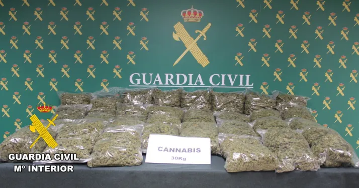 La Guardia Civil, en colaboración con INTERPOL y en el marco de la Operación SELONI, ha aprehendido 30 kilogramos en cogollos de marihuana y detenido a JMRC (44) como presunto autor de un delito contra la salud pública por tráfico de drogas.