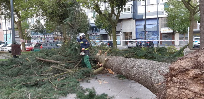 Los Bomberos de Burgos han tenido que emplearse a fondo durante las últimas horas ante los numerosos avisos que han recibido por la caída de ramas y árboles sobre la calzada y coches aparcados, provocado por las fuertes rachas de viento huracanado en la capital burgalesa.