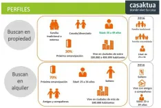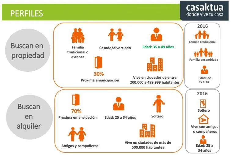 ¿Cómo es el comprador de vivienda y el inmueble a adquirir?El perfil del comprador español es una persona casada, de entre 35 y 49 años, con familia tradicional y que vive en ciudades de más de 200.000 habitantes. El inmueble tipo que buscan es muy similar al de 2016: pisos (49%), seguido de los chalets (20%) y la casa adosada, con un 10%. En general, los que viven actualmente en piso, apartamento o chalet, buscan un inmueble de la misma tipología.