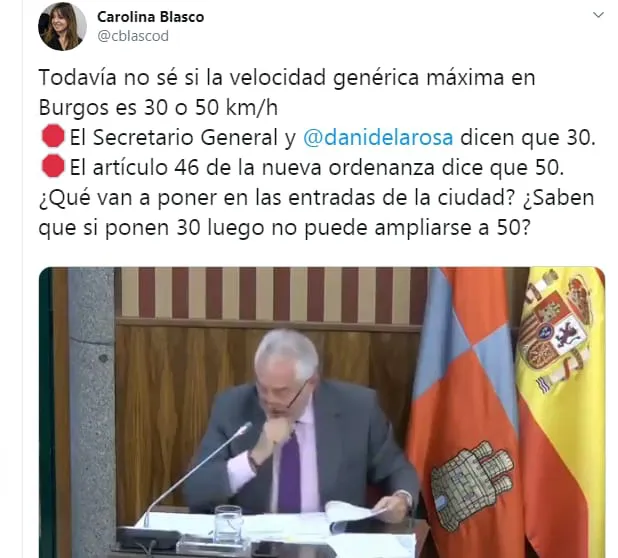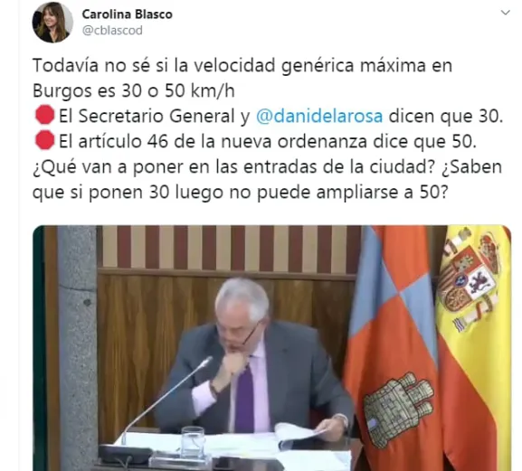 Este caos informativo, que más que nadie los políticos deberían saber resolver, ha sido protagonizado por los grupos municipales de PP y PSOE. Todo comenzaba con un tuit de la concejala 'popular', Carolina Blasco, que preguntaba directamente al alcalde socialista, Daniel de la Rosa, si la velocidad genérica máxima en la capital burgalesa es de 30 ó 50 km/h.