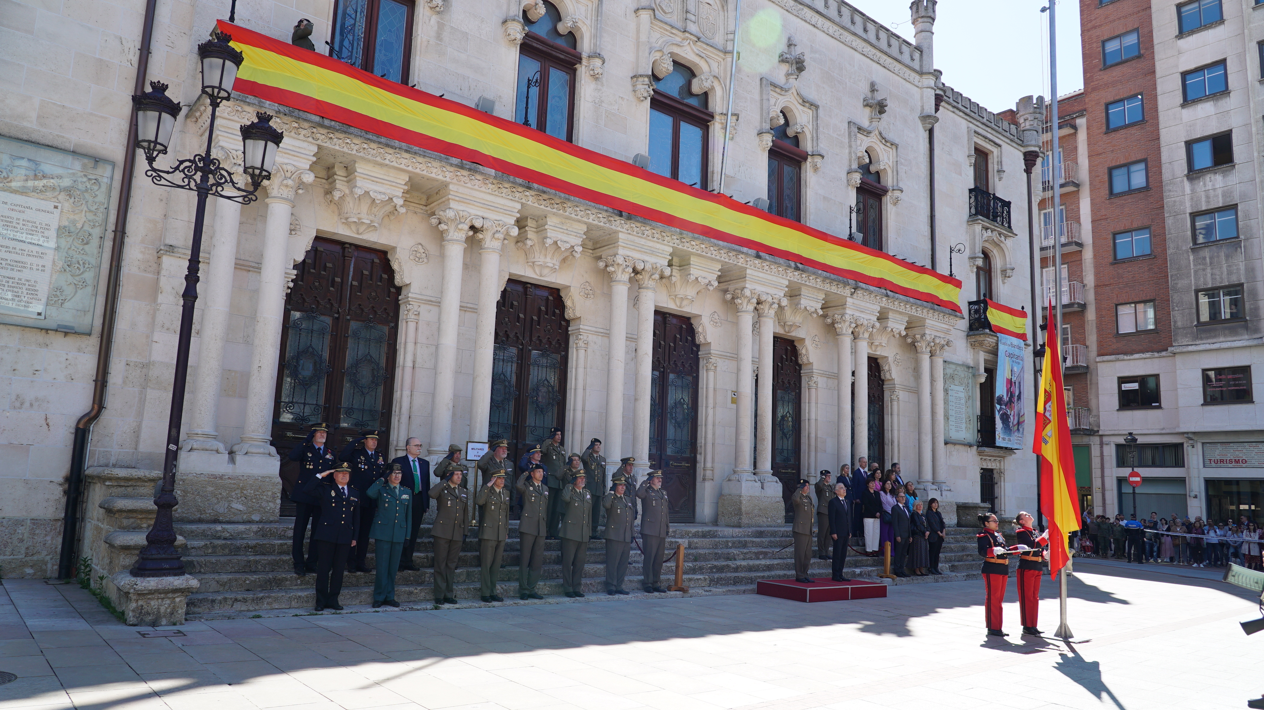 El izado estuvo presidido por el Jefe de la División San Marcial y Representante Institucional del Ejército de Tierra en Castilla y León y Cantabria, General de División Mariano Arrazola Martínez, acompañado del Delegado Territorial de la Junta de Castilla y León D. Roberto Saiz Alonso.