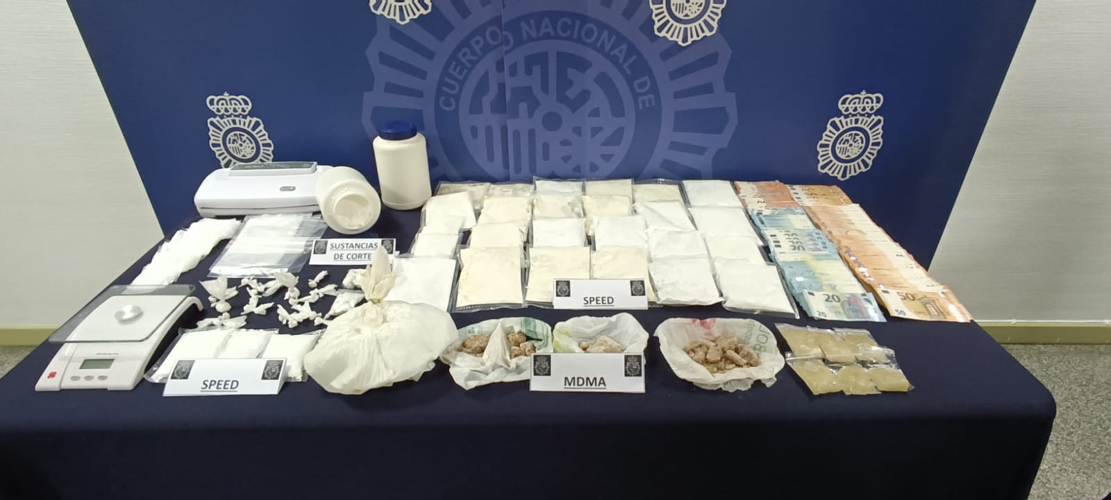 En el registro domiciliario se encontraron más de 5.000 gramos de sulfato de anfetamina pura, sin adulteración (droga madre), 1.800 gramos de sustancia de corte, diversos útiles como básculas de precisión, envasadoras para la preparación de cualquier encargo y 7.185 euros en efectivo.