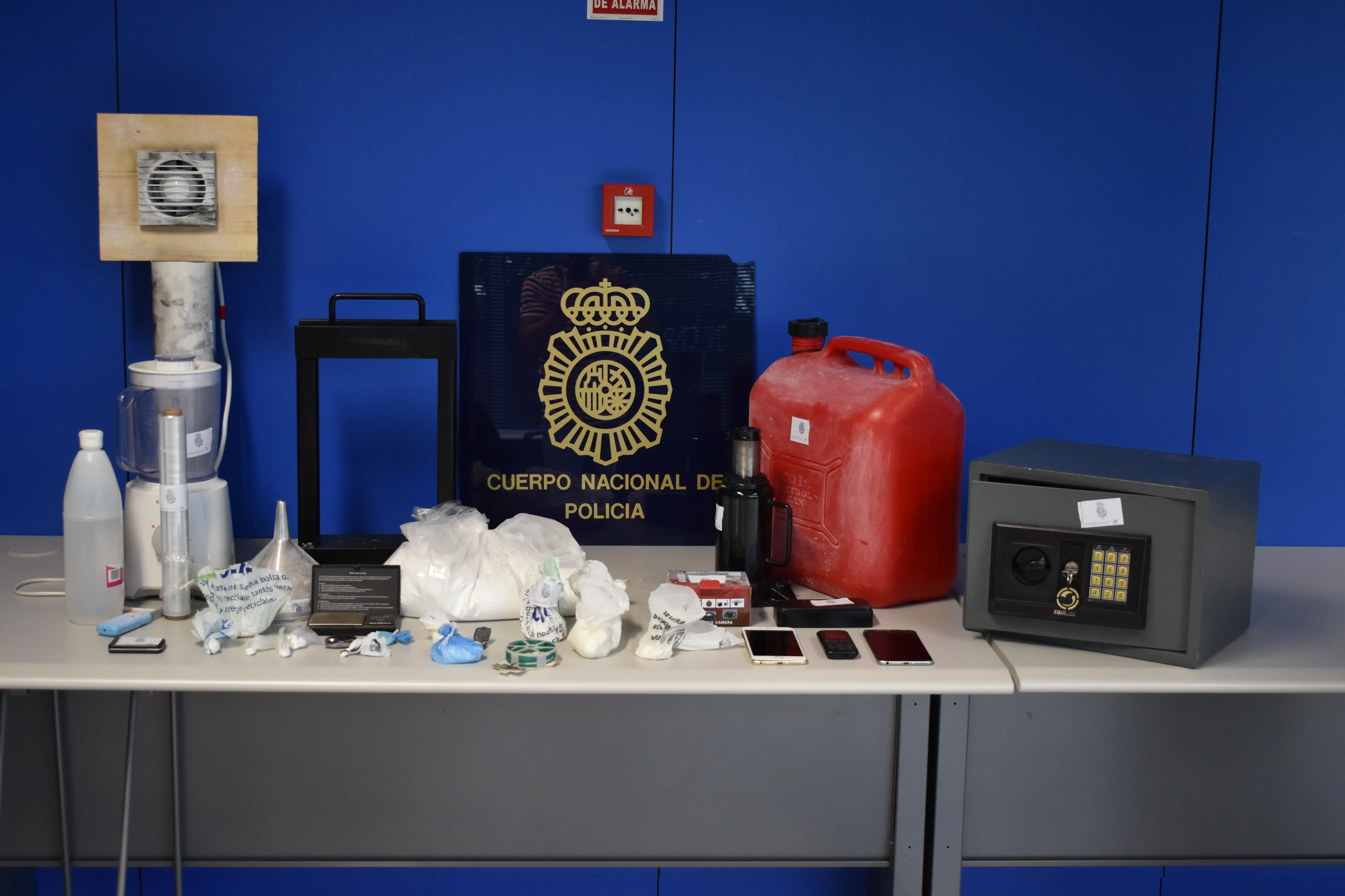 En uno de los trasteros de la vivienda se localizó un pequeño laboratorio dedicado a la cocción de la ketamina, pasándola del estado líquido al sólido. Se intervinieron un extractor diseñado al uso, varios recipientes, tubos-manguera, dos coladores, embudos, útiles de fabricación y cuatro garrafas con diferentes productos químicos necesarios para la elaboración de droga.