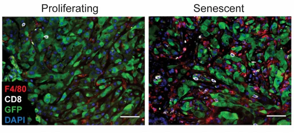 Un programa inmunogénico reconectadoSegún el mecanismo que han descubierto los investigadores, la inducción de la senescencia pone en marcha un programa molecular, que no solo remodela el entorno tisular de las células tumorales, sino que también incrementa su receptividad a ciertas señales en el mismo. Este programa de "percepción" activado por la senescencia puede hacer a las células cancerígenas más "visibles" al sistema inmune ya que amplifica la actividad de señales inmunoactivadoras, y es necesario para desencadenar respuestas inmunes anti-tumorales efectivas.