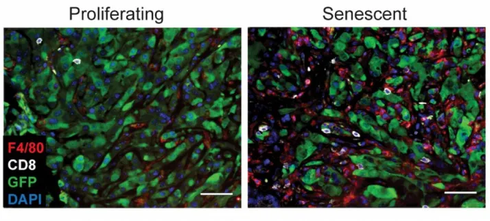 La senescencia es un estado en el que las células no se reproducen pero tampoco mueren. En cambio, producen y segregan una serie de factores proinflamatorios. Diversos tipos de estrés celular pueden provocar esta condición, como la activación de algunos oncogenes (genes relacionados con el desarrollo del cáncer) o en respuesta a ciertos fármacos antitumorales. Cuando esto ocurre, la senescencia puede inducir una potente respuesta supresora de tumores al alertar al sistema inmune de la presencia de células mutadas o dañadas, y contribuir en la eficacia en algunas terapias.
