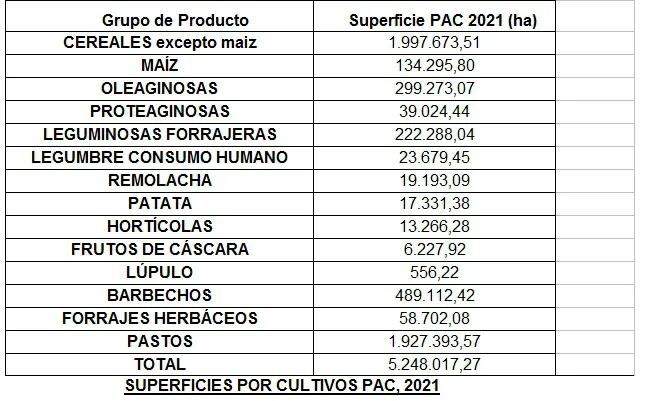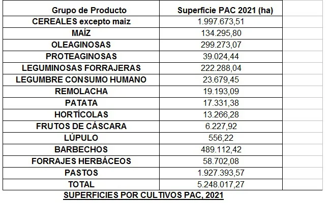 Los cereales (excepto el maíz), los pastos, los barbechos, las oleaginosas y las leguminosas forrajeras son las que ocupan las mayores extensiones.
