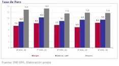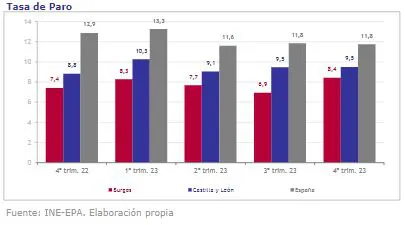 Finalmente, la última Encuesta de Población Activa -EPA- publicada por el INE señalaque la tasa de paro del cuarto trimestre de 2023 se determina en el 8,4%, inferior a lasapuntadas en Castilla y León (9,5%) y en España (11,8%); asimismo, revela que la tasade actividad del cuarto trimestre de 2023 se dispone en el 58,0%, situándose entre el54,6% autonómico y el 59,0% estatal.