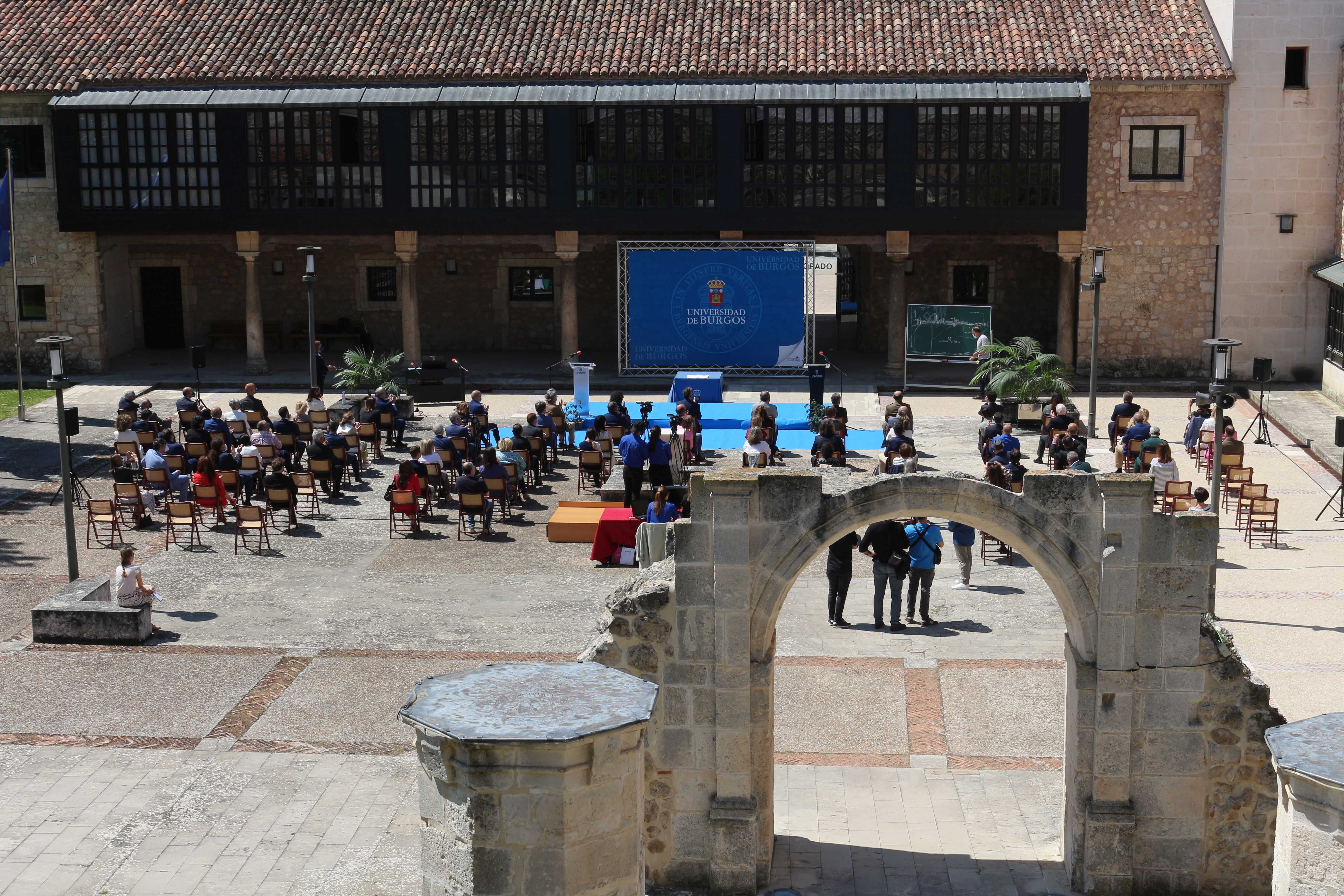 El secretario general de la Universidad, Julio Pérez Gil, leyó el acto de concesión de la Medalla de la Universidad de Burgos al colectivo de trabajadores de la Sanidad Pública de Burgos en "Reconocimiento a su trabajo, dedicación y entrega durante la pandemia SARS CoV-2 (Covid-19), reconocimiento que no debe ser sino un paso más en la demostración de la gratitud que nuestra sociedad está obligada a mantener permanentemente hacia este colectivo de empleados públicos. La meritoria labor de médicas y médicos, enfermeras y enfermeros, auxiliares, celadoras y celadores, limpiadoras y limpiadoras y personal de administración de la sanidad pública no arranca con la aparición de la Covid-19. Nuestro país siempre ha presumido de tener la que se consideraba como la mejor sanidad pública del mundo, si bien esta consideración contrastaba con el reconocimiento social, económico y laboral que desde las distintas administraciones públicas se otorgaba a sus profesionales"