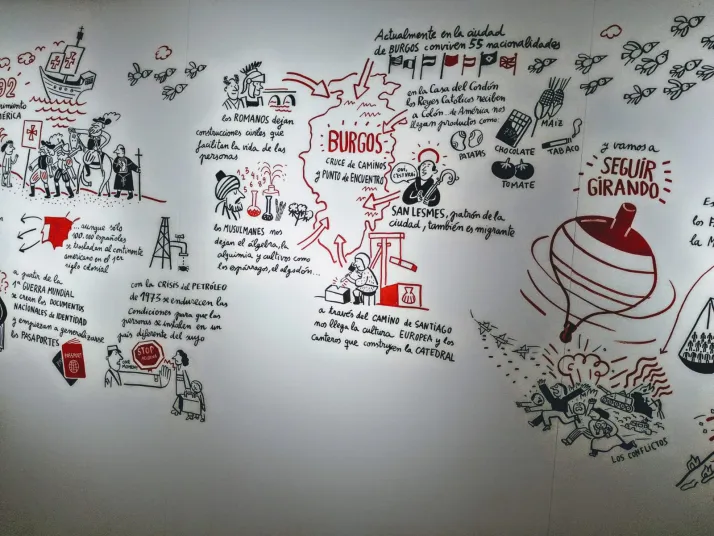 La sala de exposiciones acoge "El mundo gira y gira...", una intervención de scribing realizada por el ilustrador Jorge Martín, que a través del dibujo conforma un relato visual de las migraciones y sus beneficios a lo largo de la historia.