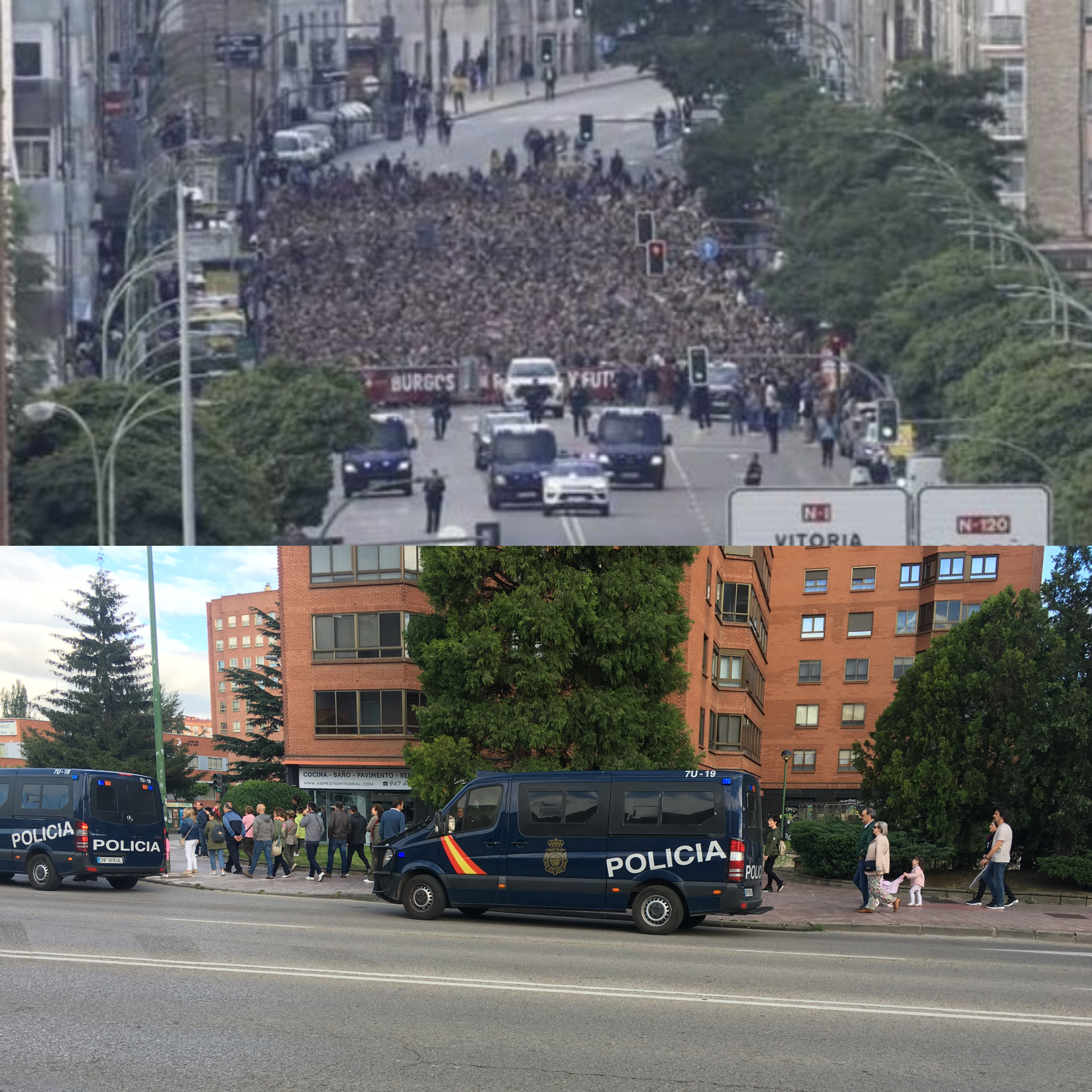 En esta jornada por lo menos 5 furgonas de las Unidades de Intervención Policial llegadas desde Valladolid se dejaron ver en el recorrido. El colmo era que 15 agentes a pie y tres furgonetas 'vigilaban' la Subdelegación del Gobierno en la calle Vitoria al paso de los manifestantes. Estos, lo más que dijeron frente al edificio era: "los de la acera a la carretera".