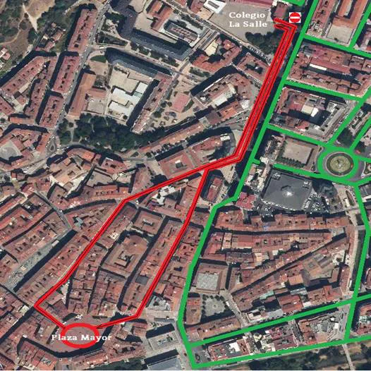 - Itinerario: Colegio de La Salle, avenida del Cid, calle la Concordia, Plaza Alonso Martínez, calle Laín Calvo, calle La Paloma, Plaza Rey San Fernando.